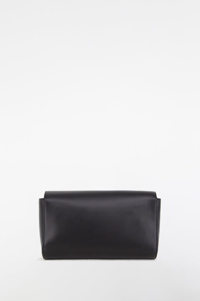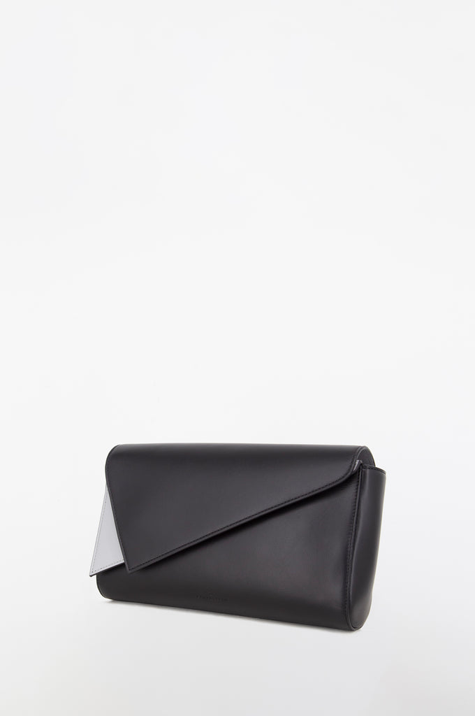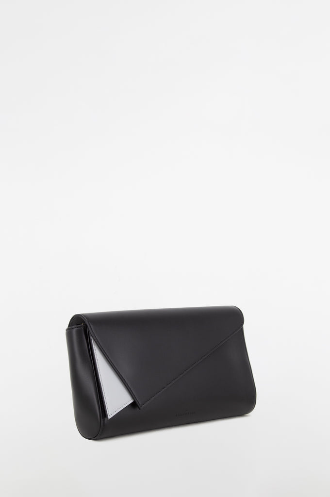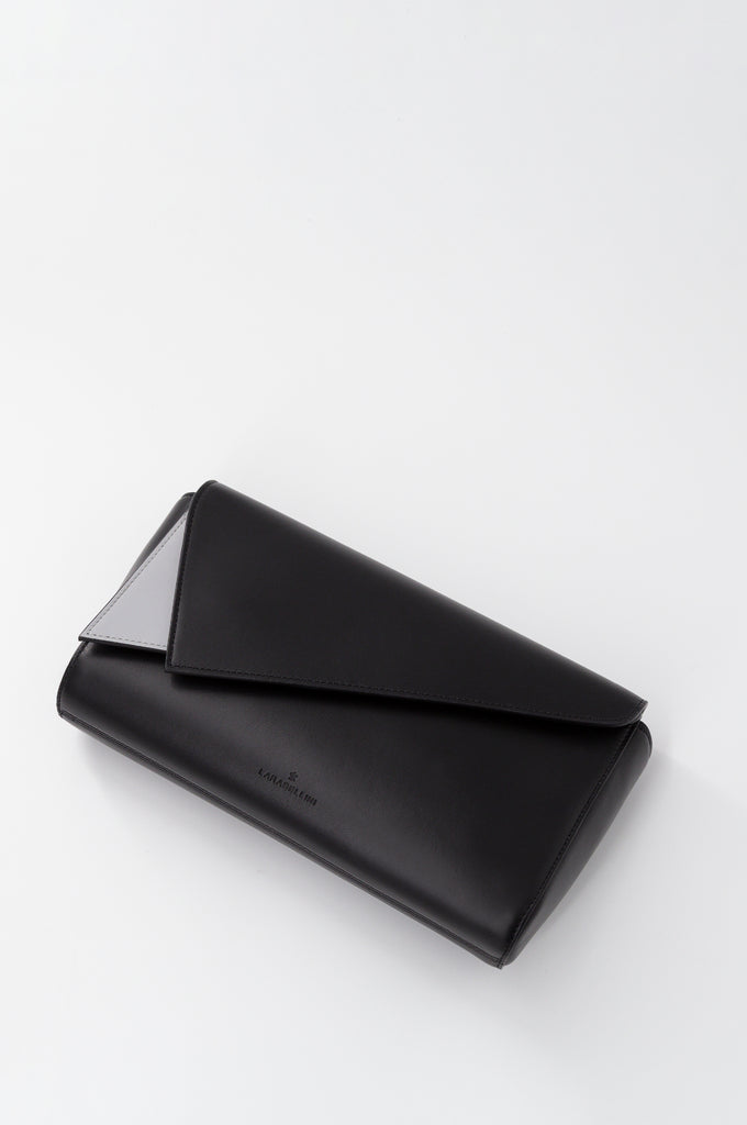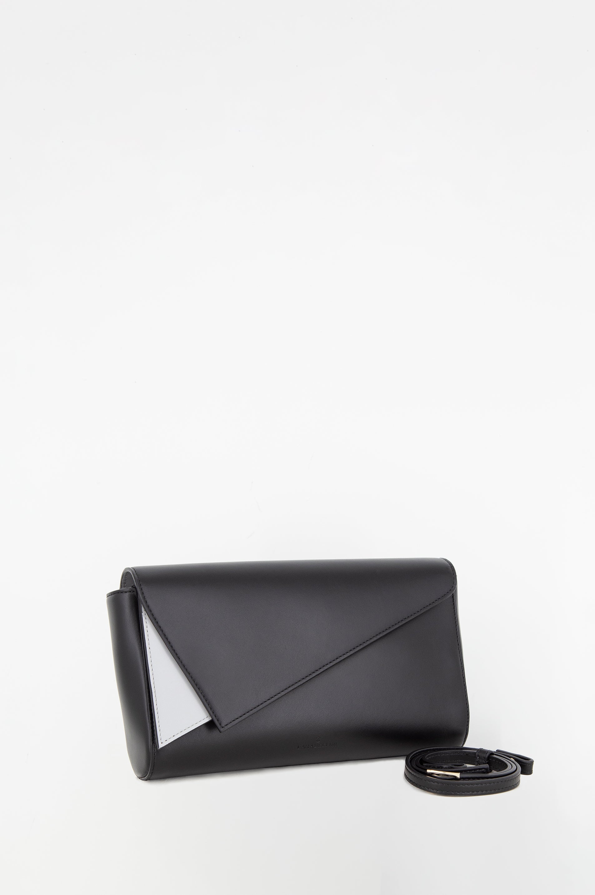 Calfskin leather bag with geometric details reminiscent of the lines of a sailboat. Adjustable and removable shoulder strap, front pocket, and double magnetic closure. Light gold-plated finishes. Handmade in Milan with high-quality materials.