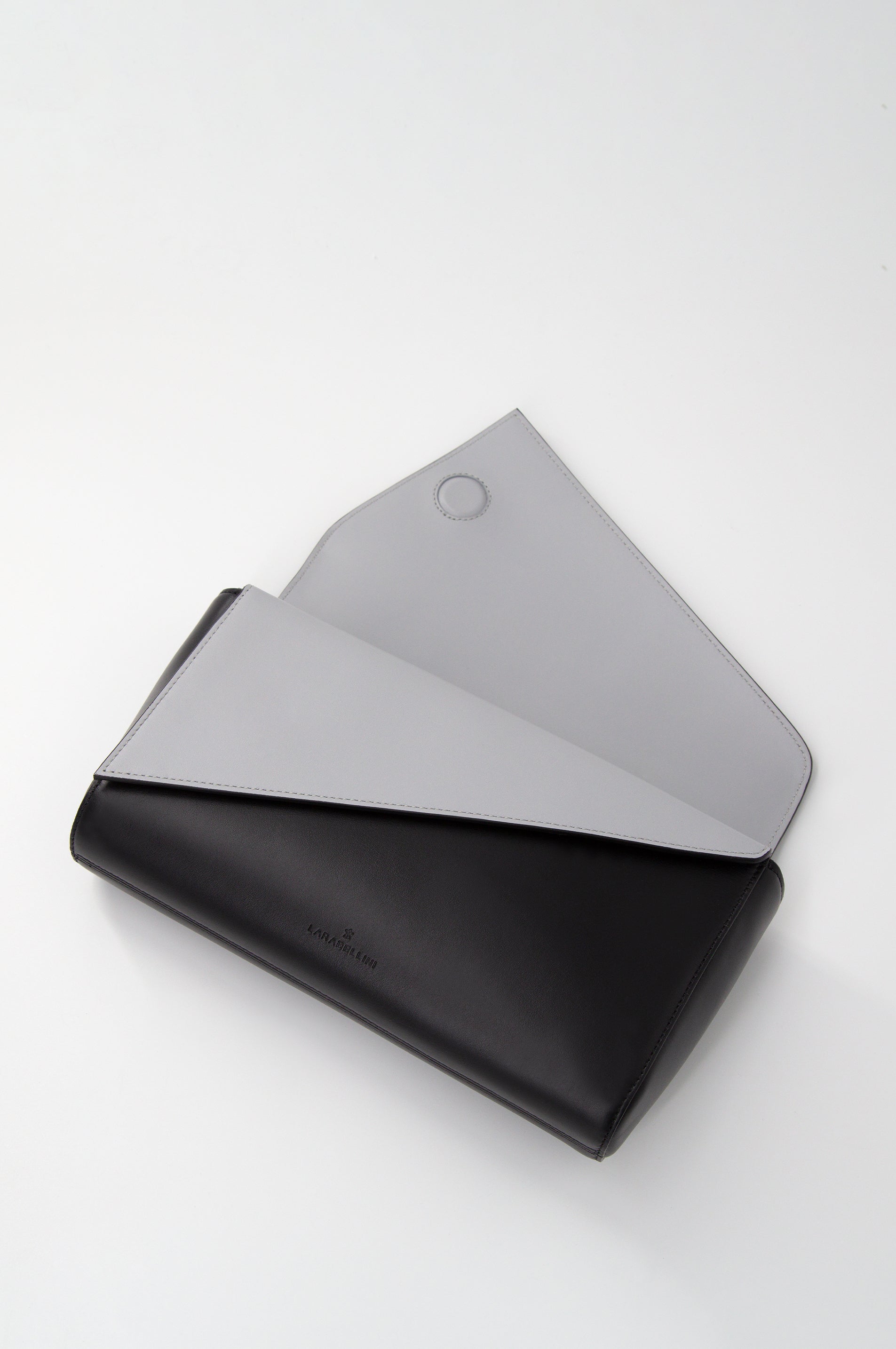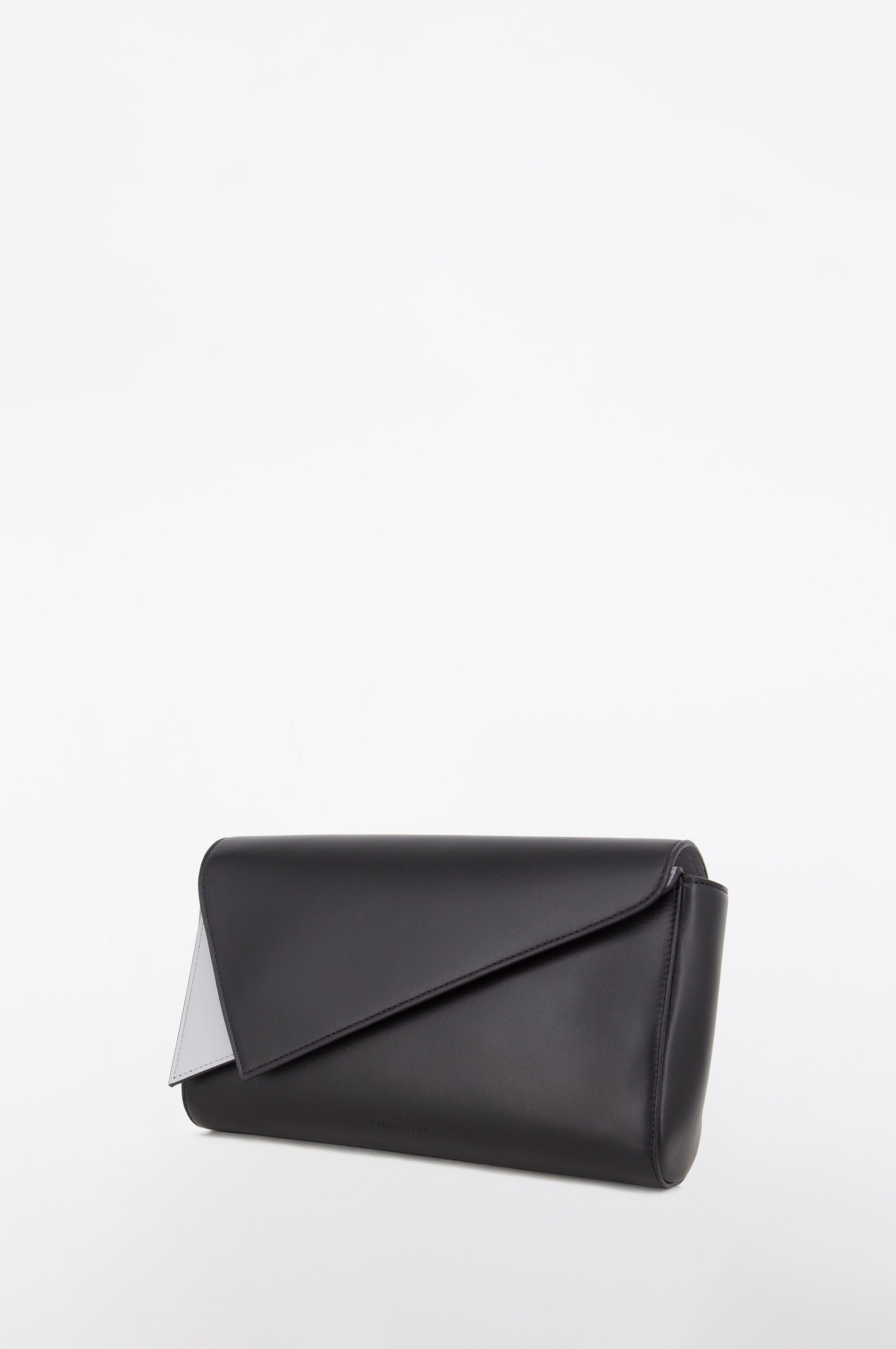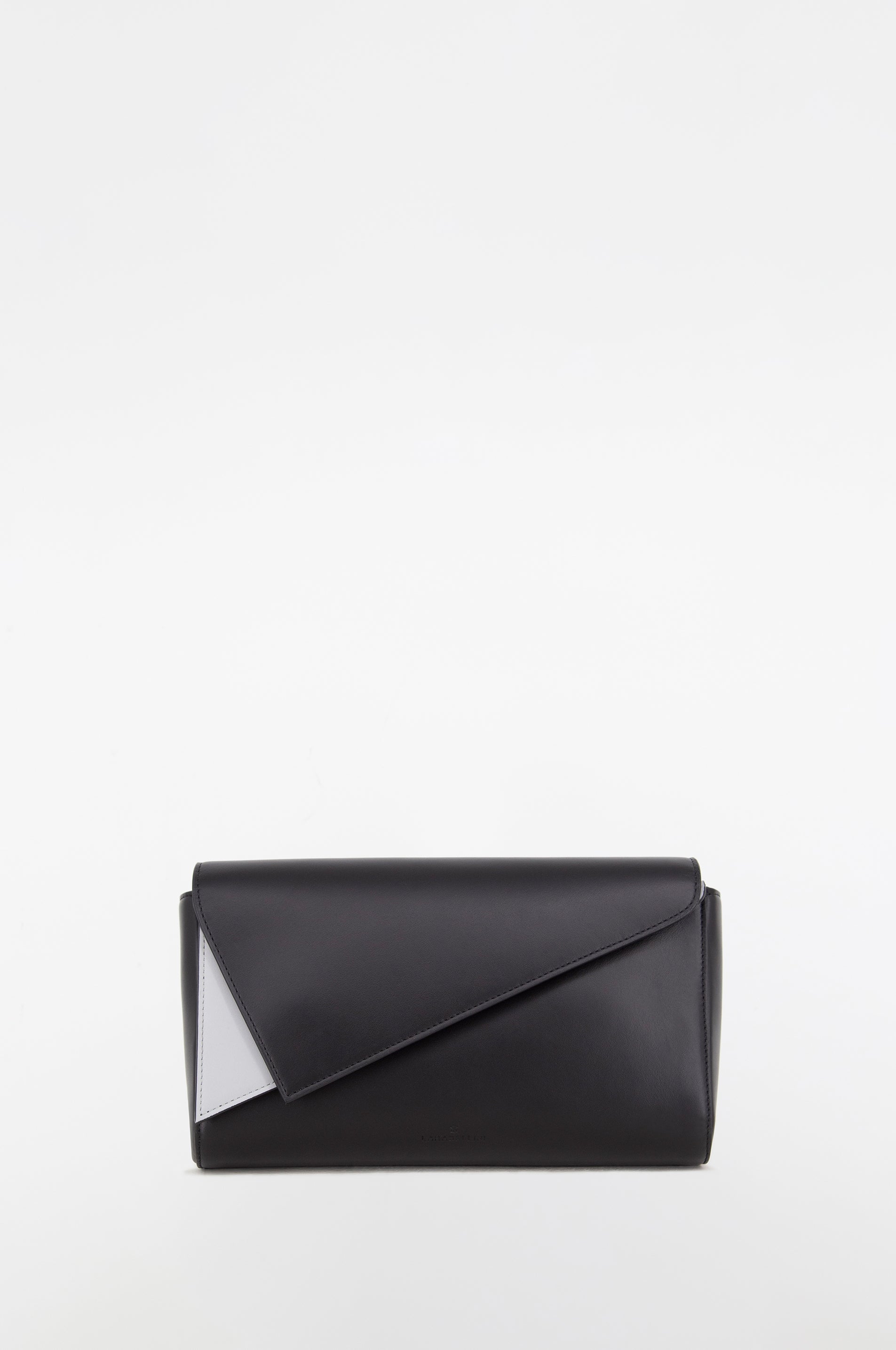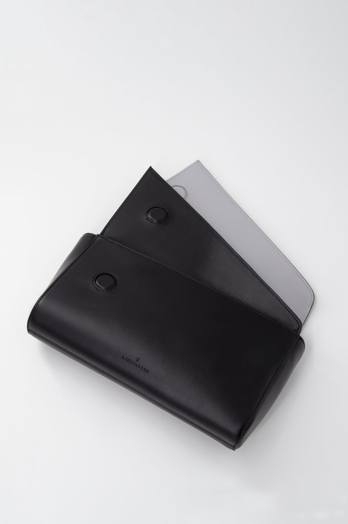 Calfskin leather bag with geometric details reminiscent of the lines of a sailboat. Adjustable and removable shoulder strap, front pocket, and double magnetic closure. Light gold-plated finishes. Handmade in Milan with high-quality materials.